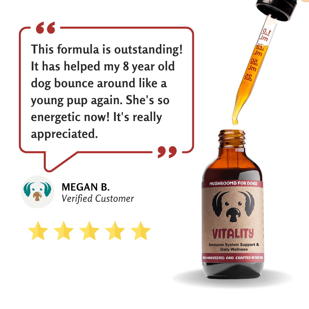 Our Vitality tincture blends Turkey Tail, Reishi, Shiitake, Maitake, Chaga, Artist Conk,mushrooms with Astragalus Root and Ashwagandha to support cellular health, immune and inflammatory balance, and overall wellness in sensitive or aging dogs.