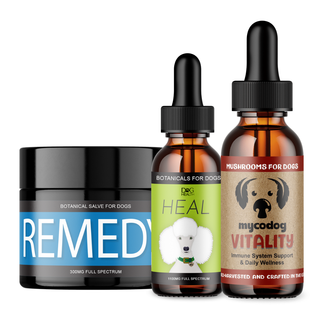 When your dog is facing significant health hurdles, a surface-level approach isn't enough. This trio provides a 360-degree foundation, combining high-concentration botanical extracts, with adaptogens and mushroom extracts to support healthy cell turnover and a balanced immune response from the inside out. By pairing these with a soothing botanical salve, you ensure every part of your dog’s wellness is supported, both internally and externally.